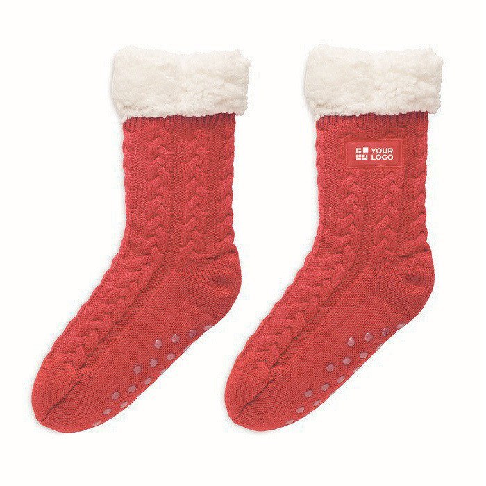 Promotie textiel doet het ook altijd goed als kerst merchandising. Deze comfortabele rode of grijze huissokken hebben antislipnoppen en een zachte voering.