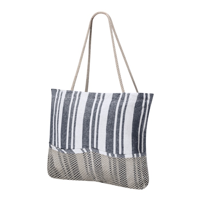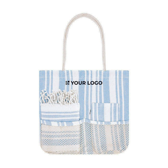 Set van tas, toilettas en pareo, grotendeels gemaakt van katoen 180 g/m². Bedoeld voor onderweg en voor dagen met events in de buitenlucht. De tas heeft een bodemvouw voor extra inhoud, lange handgrepen van gevlochten katoenen koord en twee voorvakken van mesh om spullen die je vaak nodig hebt snel te pakken. De bijpassende pareo is zacht, met een gekleurde basis, witte strepen en franjes aan de uiteinden. De toilettas heeft een hoofdvak met ritssluiting. Aanrader voor zomercampagnes, bedrijfsreizen of merkpromoties.