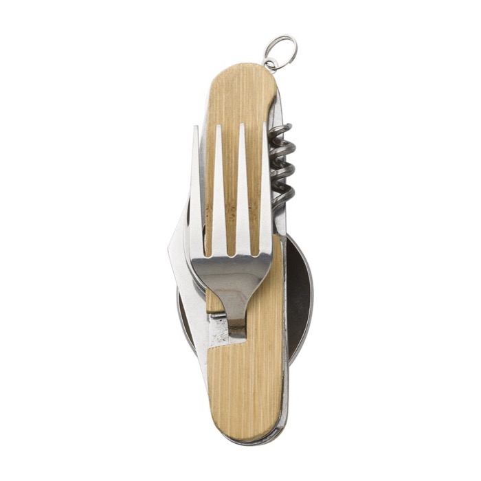 Bamboe multifunctionele bestekset (lepel, vork, mes, flesopener, kleiner mes). Bestek kan voor beide handen gescheiden worden. Individueel verpakt in een bruine kartonnen doos.