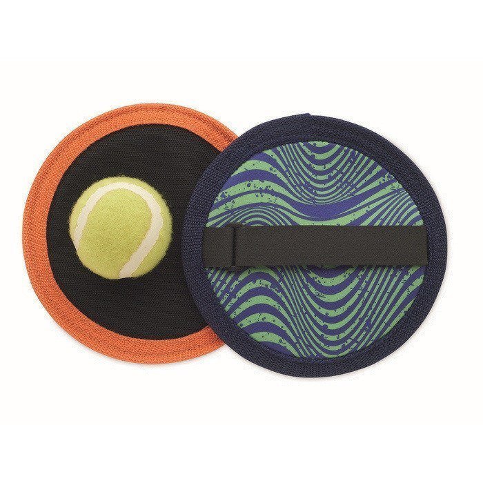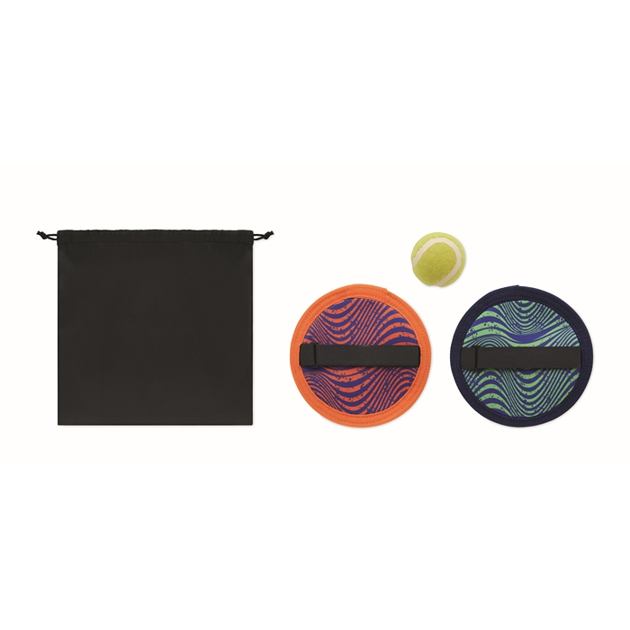 Neopreen vangbalspel voor buitenactiviteiten en evenementen. Inclusief 1 bal en een paar vangscheppen om met z’n tweeën of in kleine groepen te spelen. Geleverd in een RPET-nettas met trekkoord, handig om de set te vervoeren en op te bergen zonder ruimte in te nemen. Flexibel en comfortabel materiaal, ontworpen voor snelle spelvormen op het strand, in parken of tijdens bedrijfsdagen. Handige optie voor teambuildingactiviteiten of geschenken in zomercampagnes.